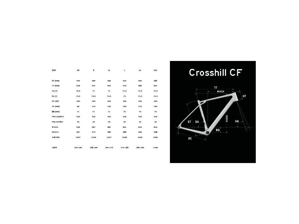 V řadě Crosshill CF je sedm modelů, z nichž dva mají odpružené vidlice se zdvihem 30 a 40 mm pro náročnější použití v horách nebo na kamenitých cestách. Nižší modely jsou osazeny extrémně pohodlnými, hliníkovými řídítky (rise: 12 mm, drop 114 mm). U vyšších modelů jsou řídítka karbonová a umožňují více sportovnější posed. Kabeláž vchází do rámu už v představci a nic tak nekazí dokonalý vzhled.