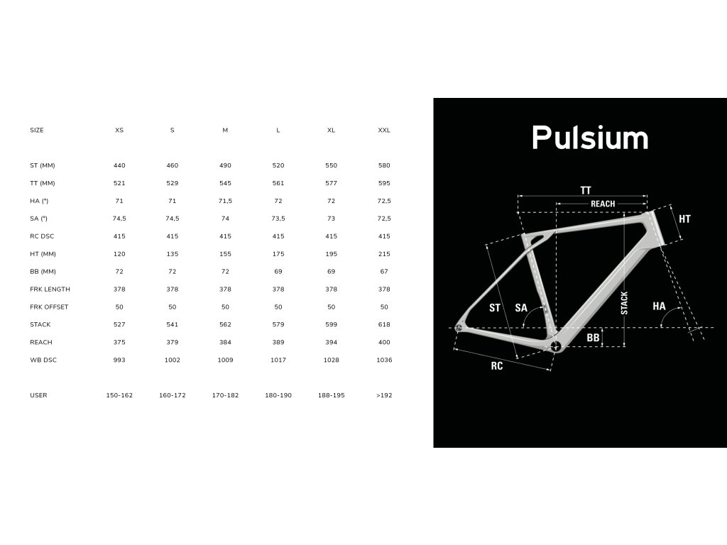 Dojíždění na kole, bikepacking, závody na ultra-vzdálenosti nebo cross-trénink špičkových sportovců, kteří chtějí udržet trénink pestrý a zajímavý! Pro jeho geometrii a všestranné schopnosti není nic nemožné – umožňuje jízdu kdekoli (štěrk, dlážděné silnice nebo dobře udržované stezky). Pulsium nabízí jemnost a charakter zaměřený na vzdálenosti: vše v jeho DNA směřuje k touze po dálce, počínaje jeho několika úchyty pro nosiče a blatníky až po prostor na 38mm pláště.