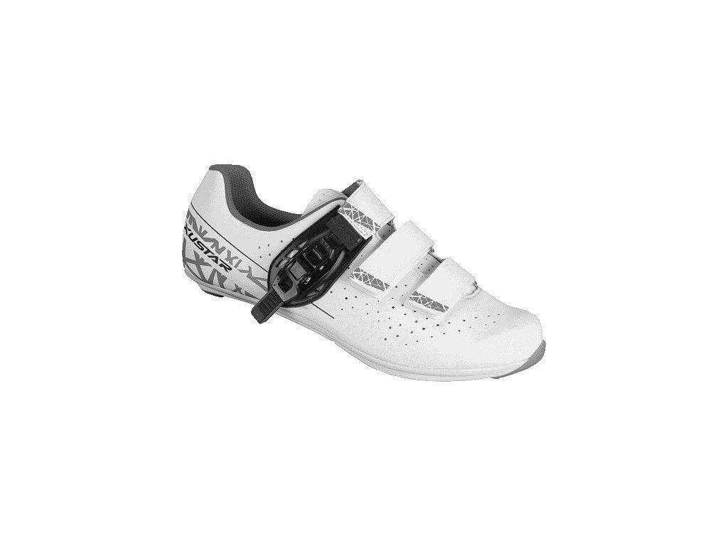 Sportovní siniční tretry Exustar. Tvarovaný, pohodlný svršek z PU kůže s prodyšnou síťovinou a přezkou Microlock. Kompozitní podešev z nylonu a skleněných vláken má vestavěné ventilační otvory Air Control, které vás udrží v chladu, a protiskluzové vycpávky jsou připraveny, když se vaše nohy dotknou země.